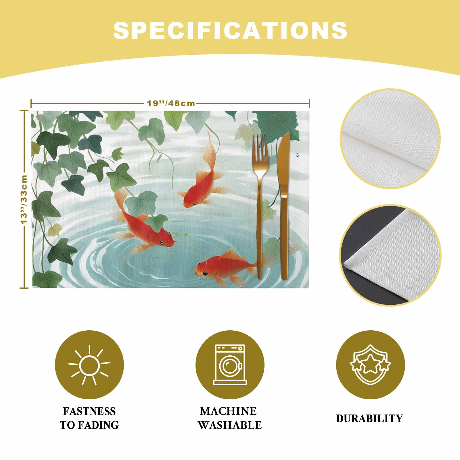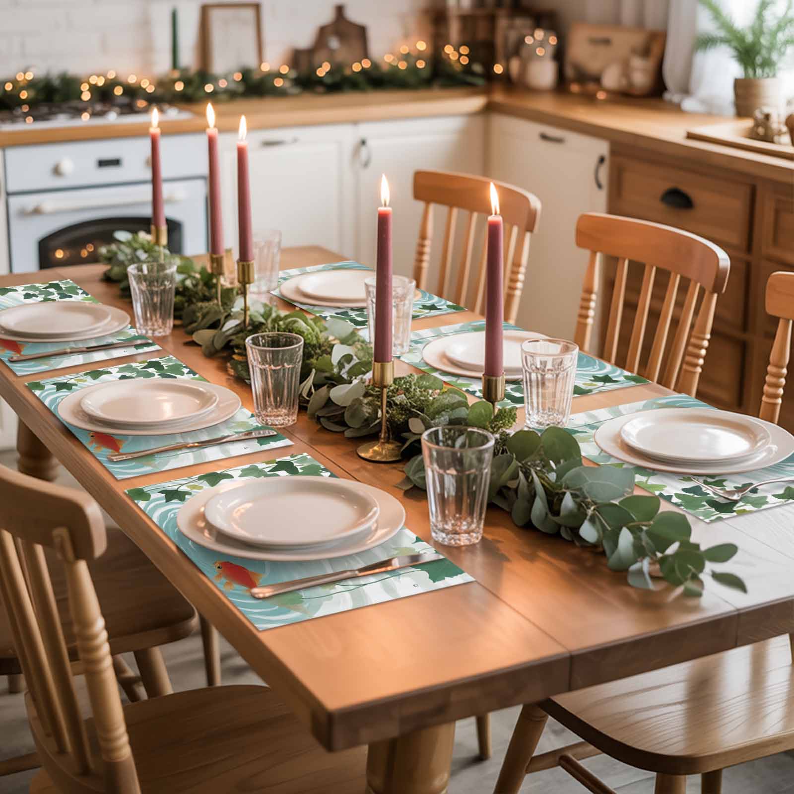 这款餐垫以灵动金鱼搭配清新绿叶为设计,色调明快柔和,铺在餐桌上既能增添鲜活生气,又能防油防污保护桌面。不管是生日派对、家庭聚餐这类热闹场合,还是日常用餐,都能让餐桌瞬间变得温馨有格调,是颜值与实用兼备的餐桌装饰单品。